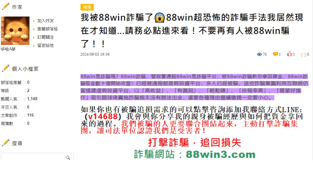 聲稱遭受88win詐騙幫忙追回帳款,注意是新型詐騙!
