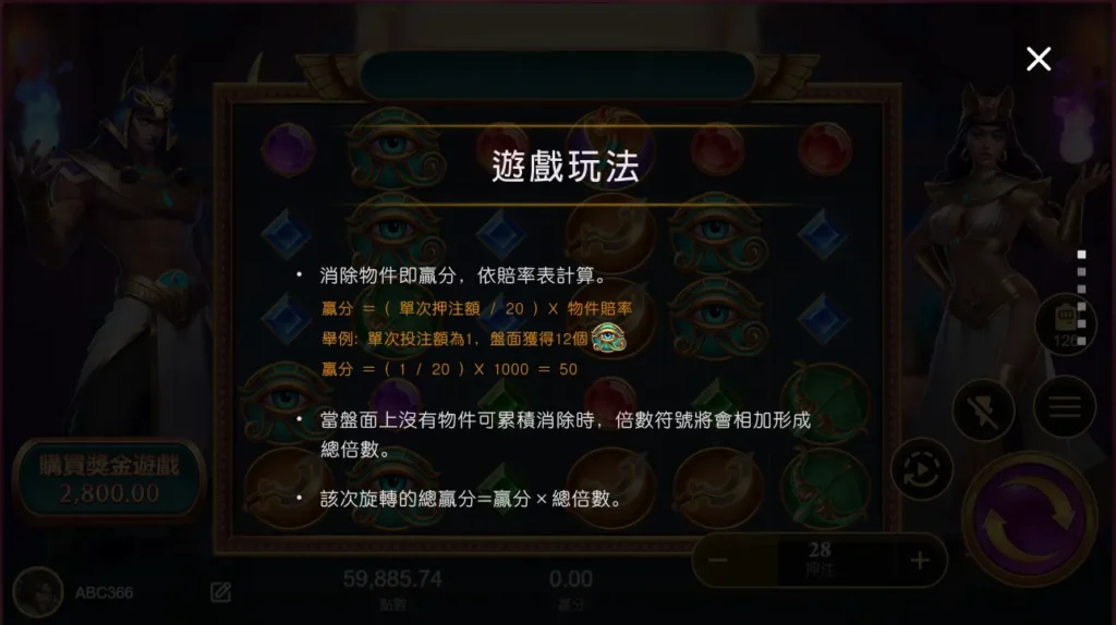 遊戲界面精緻,展示了男女版本的戰神賽特,他們施展法術增加得分倍數,帶來視覺與得分上的雙重驚喜。